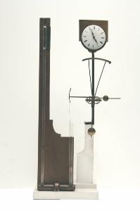Su una base in legno (l'originale è in marmo) è montato un tubo barometrico a sifone in ferro e vetro. Nel braccio più corto del sifone è inserito un galleggiante collegato ad un\nbilanciere di ottone munito di contrappesi e montato su ruote antifrizione. Sul bilanciere, che reca la scala barometrica, è tesa una striscia di carta. Al di sopra del bilanciere e fissato alla base è collocato un orologio.