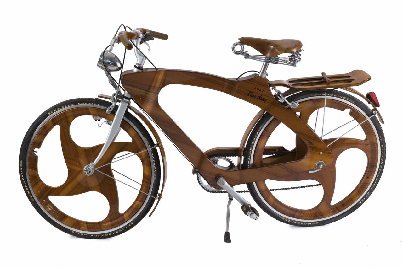Telaio a seduta verticale a cui sono vincolate due ruote allineate una dietro l'altra; è dotato di un sistema meccanico per la trasmissione della potenza alla ruota motrice. Sulla ruota posteriore è montato un meccanismo di ruota libera, che permette alla bicicletta di avanzare per inerzia senza dover muovere i pedali. E' presente un cambio di velocità, costituito da ingranaggi multipli, sulla ruota posteriore. Lo sterzo è basato su una forcella che regge la ruota anteriore, incernierata in un canotto leggermente inclinato in avanti, solidale con un manubrio in legno munito di manopole realizzate in pelle. Lo sterzo e la forcella sono in alluminio anodizzato. I freni sono posti in prossimità dei cerchioni mentre i comandi dei freni sono sul manubrio. Per ridurre l'attrito delle parti in movimento, vengono utilizzati cuscinetti a sfere. I cuscinetti sono presenti anche sul movimento centrale, sui pedali, sullo sterzo e sul meccanismo di ruota libera. La bicicletta è dotata di sei rapporti del cambio Shimano, di parafango anteriore e posteriore in legno, di paracatena in legno, di due luci a dinamo (quella anteriore di colore rosso e quella posteriore munita di due lampade e di un deviatore), di portapacchi in legno, di due pneumatici delle ruote posti sui cerchioni in alluminio posti a loro volta su cerchioni in legno a quattro raggi, di una sella in cuoio Brooks ammortizzata da due molle in filo di acciaio intrecciato posteriori e da una anteriore e da due pedali con catadiottri. Realizzata completamente in legno ad eccezione dei meccanismi di movimentazione e di giunzione, la bici è costituita da parti composte da strati lineari e incrociati di frassino e faggio e da parti meccaniche in alluminio, ancorate al telaio con colle ureiche ad alta resistenza di tenuta. E' munita di cavalletto in alluminio. Il materiale del telaio è la composizione di legno di faggio e di frassino a strati pressati ad alta frequenza con inserti di legno duro. La componentistica è progettata appositamente per ancorare al legno le singole funzioni dei movimenti, come i mozzi delle ruote, i forcellini posteriori ed altri particolari inseriti nel telaio. La bicicletta è numerata con punzonatura a fuoco.