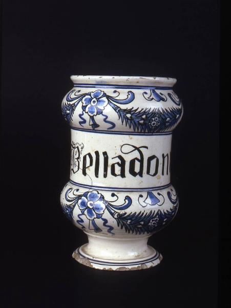 Vaso da farmacia a rocchetto, forma comunemente denominata albarello. Imboccatura con orlo leggermente estroflesso collo appena accennato. Corpo cilindrico con spalla arrotondata e larga fascia centrale. Piede piatto e svasato leggermente più alto del consueto.