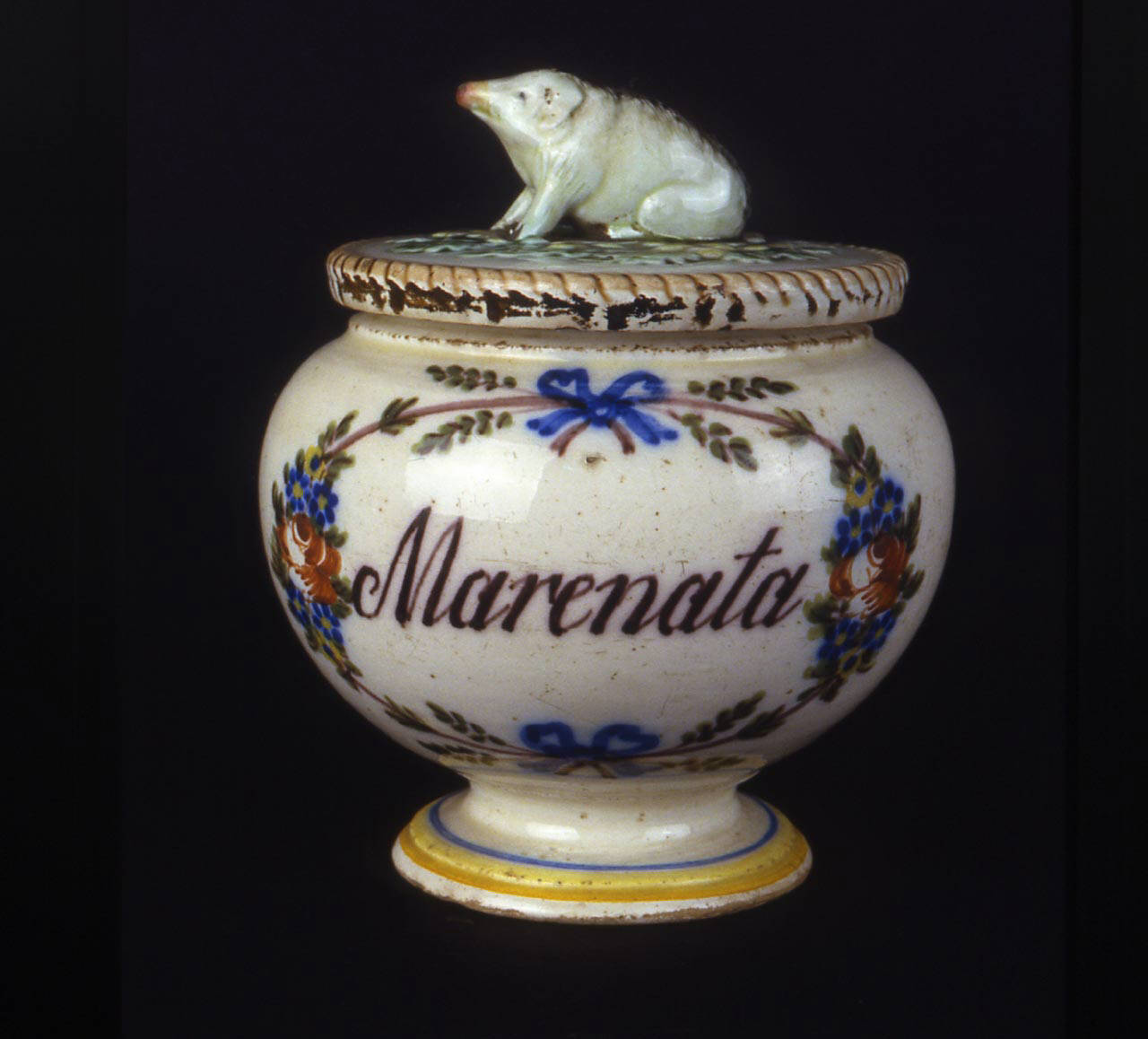 contenitore da farmacia o da drogheria. Corpo di forma sferica, su alto piede a calice con base svasata. Collo appena accennato con gradinatura lieve che accoglie un coperchio piatto, sormontato da ansa plasmata a forma di piccolo cinghiale.
