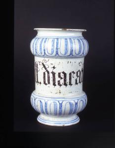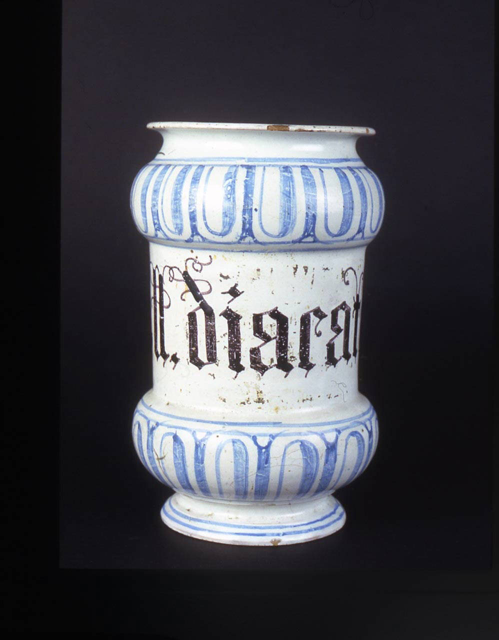 Vaso a rocchetto, forma comunemente denominata albarello, con struttura tipica settecentesca con piede piano svasato, non molto alto, spalla arrotondata, collo cilindrico breve con larga imboccatura ad orlo estroflesso.