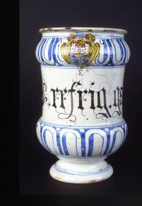 Vaso a rocchetto, forma comunemente denominata albarello, con struttura tipica settecentesca con alto piede piano svasato ornato da anelli concentrici in rilievo, spalla arrotondata collo cilindrico, breve con larga imboccatura ad orlo estroflesso.