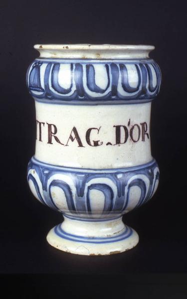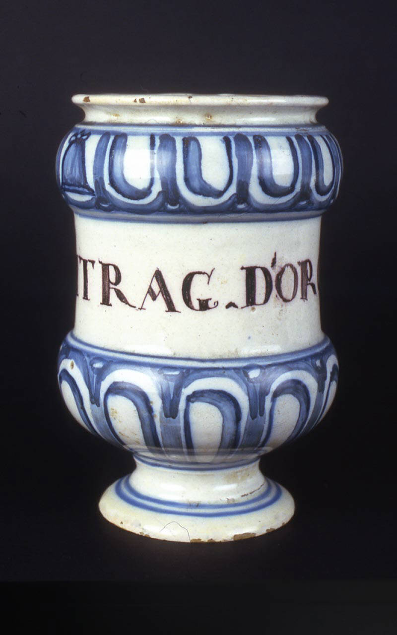 Vaso a rocchetto, forma comunemente denominata albarello, con struttura tipica settecentesca con alto piede piano svasato, spalla arrotondata collo cilindrico, breve con larga imboccatura ad orlo estroflesso.
