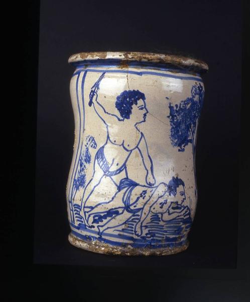 Vaso apotecario a rocchetto, forma comunemente denominata albarello. Corpo cilindrico su piede piano. Collo appena rilevato con ampia bocca con orlo estroflesso.