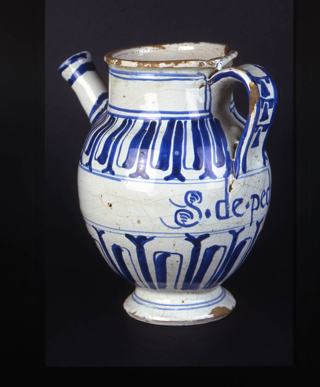 Vaso a corpo globulare su alto piede piano ed espanso, comunemente denominato orciolo. Collo cilindrico da cui si diparte, appena sotto l'orlo, una larga ansa nastriforme che scende fino a sotto la spalla. Larga apertura con orlo estroflesso. Dalla spalla si diparte un beccuccio a cannello cilindrico.