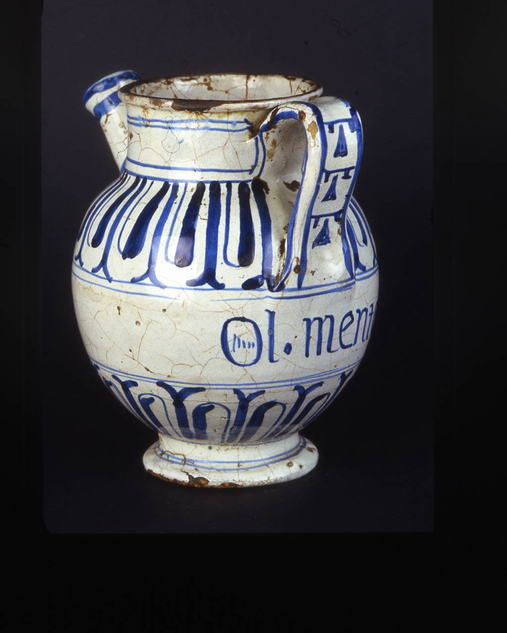 Vaso a corpo globulare su alto piede piano ed espanso, comunemente denominato orciolo. Collo cilindrico da cui si diparte, appena sotto l'orlo, una larga ansa nastriforme che scende fino a sotto la spalla. Larga apertura con orlo estroflesso. Dalla spalla si diparte un beccuccio a cannello cilindrico con orlo leggermente etstroflesso, chiuso da un tappo di sughero.