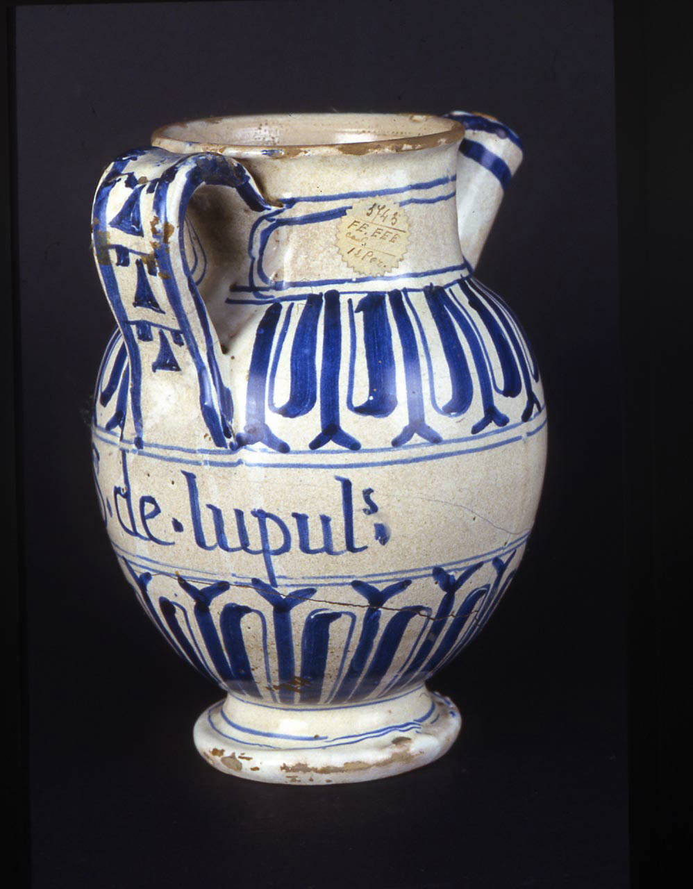 Vaso a corpo globulare su alto piede piano ed espanso, comunemente denominato orciolo. Collo cilindrico da cui si diparte, appena sotto l'orlo, una larga ansa nastriforme che scende fino a sotto la spalla. Larga apertura con orlo estroflesso. Dalla spalla si diparte un beccuccio a cannello cilindrico.