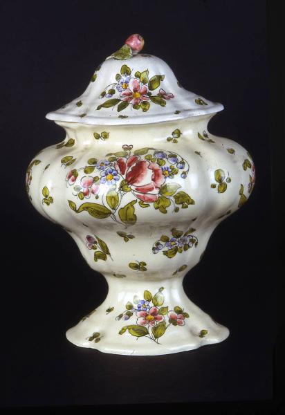 Vaso da farmacia o da drogheria, detto anche portatabacco, con forma mutuata dalle argenterie coeve. corpo con spalla pronunciata, molto sagomato che si restringe verso il piede, alto a calice fortemente svasato. Collo breve con orlo estroflesso con coperchio cuspidato con presa arrotondata, anch'esso fortemente sbalzato.