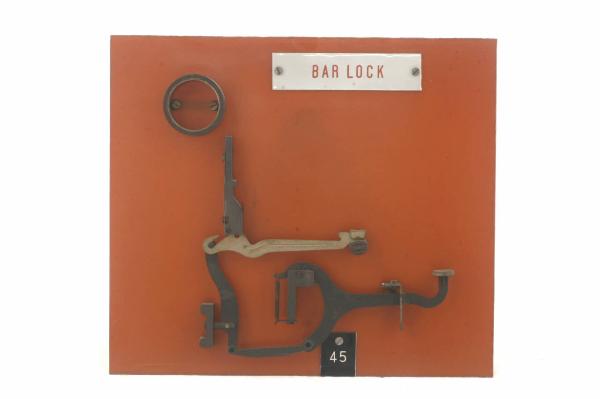 Cinematismo costituito da tre elementi principali in acciaio. La leva del tasto, tramite un tirante incernierato agli estremi inferiori, agisce su una leva centrale che a sua volta fa da tirante al martelletto portacaratteri (i caratteri riportati sono: "L" e "l"). Il bottone del tasto è in celluloide trasparente riportante i caratteri: " ° " e ")". Il movimento di ritorno del tasto è guidato dalla molla a lamina agente direttamente sulla leva del martelletto e contemporaneamente dalla molla a torsione agente sulla leva del tasto. Il cinematismo è fissato ad un pannello in bachelite.