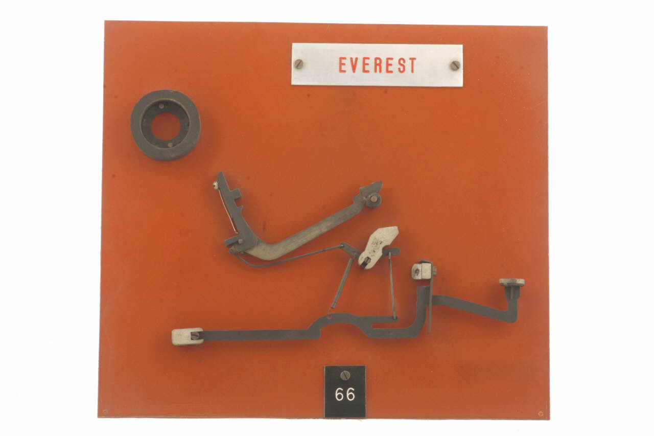 Cinematismo costituito da tre elementi principali in acciaio. La leva del tasto è collegata tramite un tirante ad una leva centrale che agisce, tramite un atro tiante, sulla leva del martelletto portacaratteri (i caratteri riportati sono: "Y" e "i"). Il bottone del tasto è in celluloide trasparente su sfondo bianco riportante il carattere "Y". Il movimento di ritorno del tasto è guidato dalla molla che agisce direttamente sulla leva del martelletto portacaratteri ed è facilitato dalla molla a torsione agente tra la leva centrale e la leva del tasto. Il cinematismo è fissato ad un pannello in bachelite.
