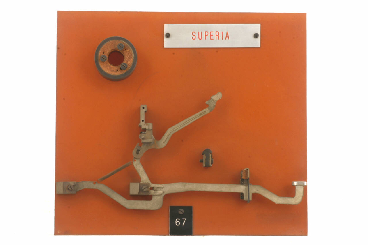Cinematismo costituito da tre elementi principali in acciaio. La leva sagomata del tasto agisce, tramite una leva centrale che fa da tirante, sulla leva del martelletto portacaratteri (i caratteri riportati sono: "H" e "h"). Le articolazioni tra le tre leve sono cerniere a scorrimento. Il bottone del tasto è in celluloide trasparente su sfondo nero riportante in bianco il carattere "H". Il movimento di ritorno del tasto è guidato dalla molla che agisce direttamente sulla leva del martelletto portacaratteri ed è facilitato dalla molla a torsione agente tra la leva centrale e la leva del tasto. Il cinematismo è fissato ad un pannello in bachelite.