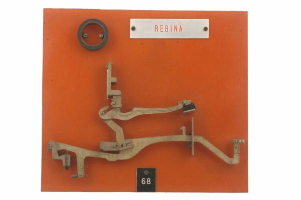 Cinematismo costituito da tre elementi principali in acciaio. La leva sagomata del tasto agisce, tramite una leva centrale che fa da tirante, sulla leva del martelletto portacaratteri (i caratteri riportati sono: "B" e "b"). Le articolazioni tra le tre leve sono cerniere a scorrimento. Il bottone del tasto è in celluloide trasparente su sfondo bianco riportante il carattere "H". Il movimento di ritorno del tasto è guidato dalla molla che agisce direttamente sulla leva del martelletto portacaratteri ed è facilitato dalla molla a compressione sulla leva del tasto. Il cinematismo è fissato ad un pannello in bachelite.