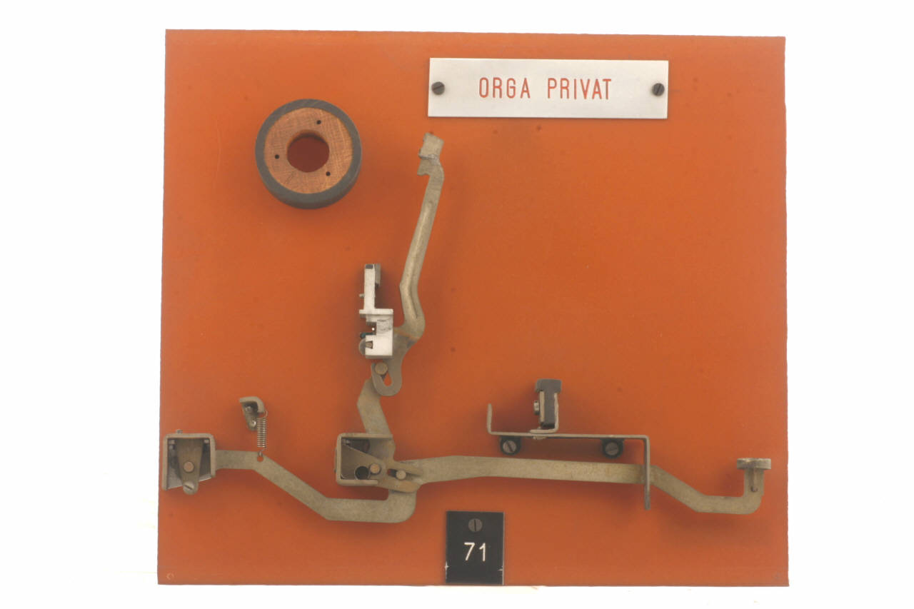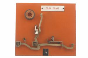 Cinematismo costituito da tre elementi principali in acciaio. La leva sagomata del tasto agisce, tramite una leva centrale che fa da tirante, sulla leva del martelletto portacaratteri (i caratteri riportati sono: "H" e "h"). Le articolazioni tra le tre leve sono cerniere a scorrimento. Il bottone del tasto è in celluloide trasparente su sfondo bianco riportante in nero il carattere "H". Il movimento di ritorno del tasto è guidato da una molla che agisce direttamente sulla leva del martelletto portacaratteri ed è aiutato dalla molla a torsione agente sulla leva del tasto. Il cinematismo è fissato ad un pannello in bachelite.