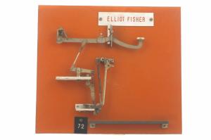 Cinematismo costituito da tre elementi principali in acciaio. La leva del tasto, posta in alto, si collega, tramite un tirante a spinta registrabile, ad una doppia leva centrale che tramite un altro tirante registrabile agisce sulla leva del martelletto portacaratteri (il carattere riportato è: "G"). Il bottone del tasto è in celluloide trasparente su sfondo bianco riportante in nero il carattere "G". Il movimento di ritorno del tasto è guidato da una molla a torsione che agisce direttamente sulla leva del martelletto portacaratteri ed è facilitato da un altra molla a torsione agente sulla leva del tasto. Il cinematismo è fissato ad un pannello in bachelite. Sul retro del pannello è annesso un esemplare di leva di martello portacaratteri munita in testa di due martelli ciascuno portante un carattere ("6" e "3") e una leva di selezione trattenuta da una molla a lamina.