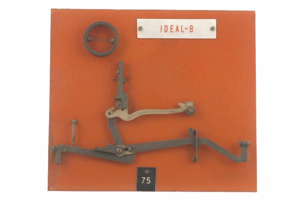 Cinematismo costituito da tre elementi principali in acciaio. La leva sagomata del tasto agisce, tramite una leva centrale che fa da tirante, sulla leva del martelletto portacaratteri (i caratteri riportati sono: "G" e "g"). Le articolazioni tra le tre leve sono cerniere a scorrimento. Il bottone del tasto è in celluloide trasparente su sfondo bianco riportante in nero il carattere "H". Il movimento di ritorno del tasto è guidato da una molla che agisce direttamente sulla leva del martelletto portacaratteri ed è aiutato dalla molla a torsione agente sulla leva del tasto. Il cinematismo è fissato ad un pannello in bachelite.