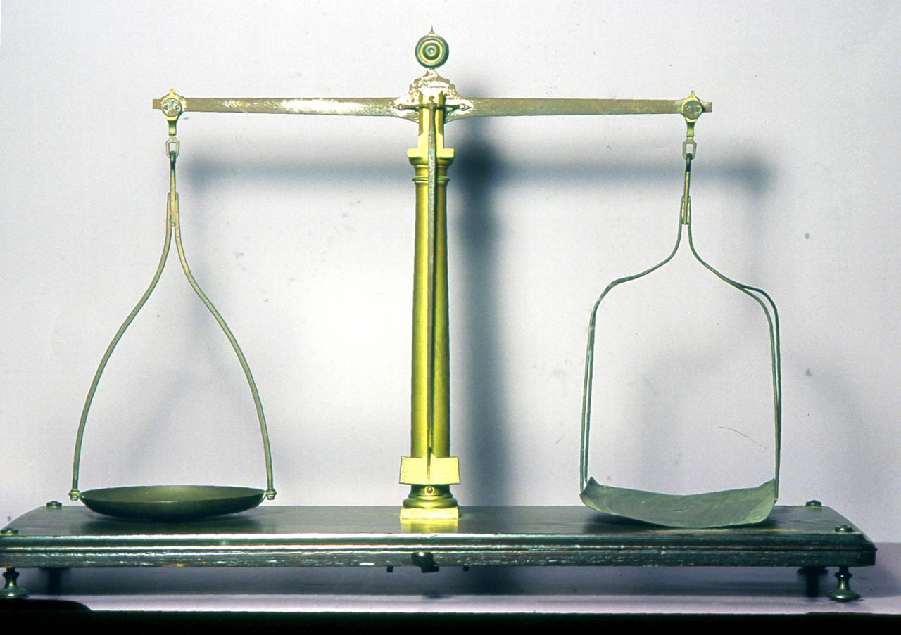 Lo strumento è composto da un giogo in ottone sospeso su un fulcro a lama di coltello. Il fulcro è solidale ad un'asta in ferro che percorre internamente una colonna in ottone e si innesta ad una leva presente sotto la base in legno delo strumento che da questa fuoriesce con una mapola al centro del lato anteriore lungo. \nIl giogo è munito nel suo centro di un lungo indice la cui estremità inferiore scorre su una scala graduata, incisa, posta alla base, circa, della colonna e solidale con essa. La colonna è fissata al centro della base in legno. Alle estremità del giogo sono incernierate, tramite perno, due aste sostenenti ciascuna un piatto in ottone. Un piatto ha forma tonda, l'altro rettangolare, entrambe presentano il rialzamento del bordo.