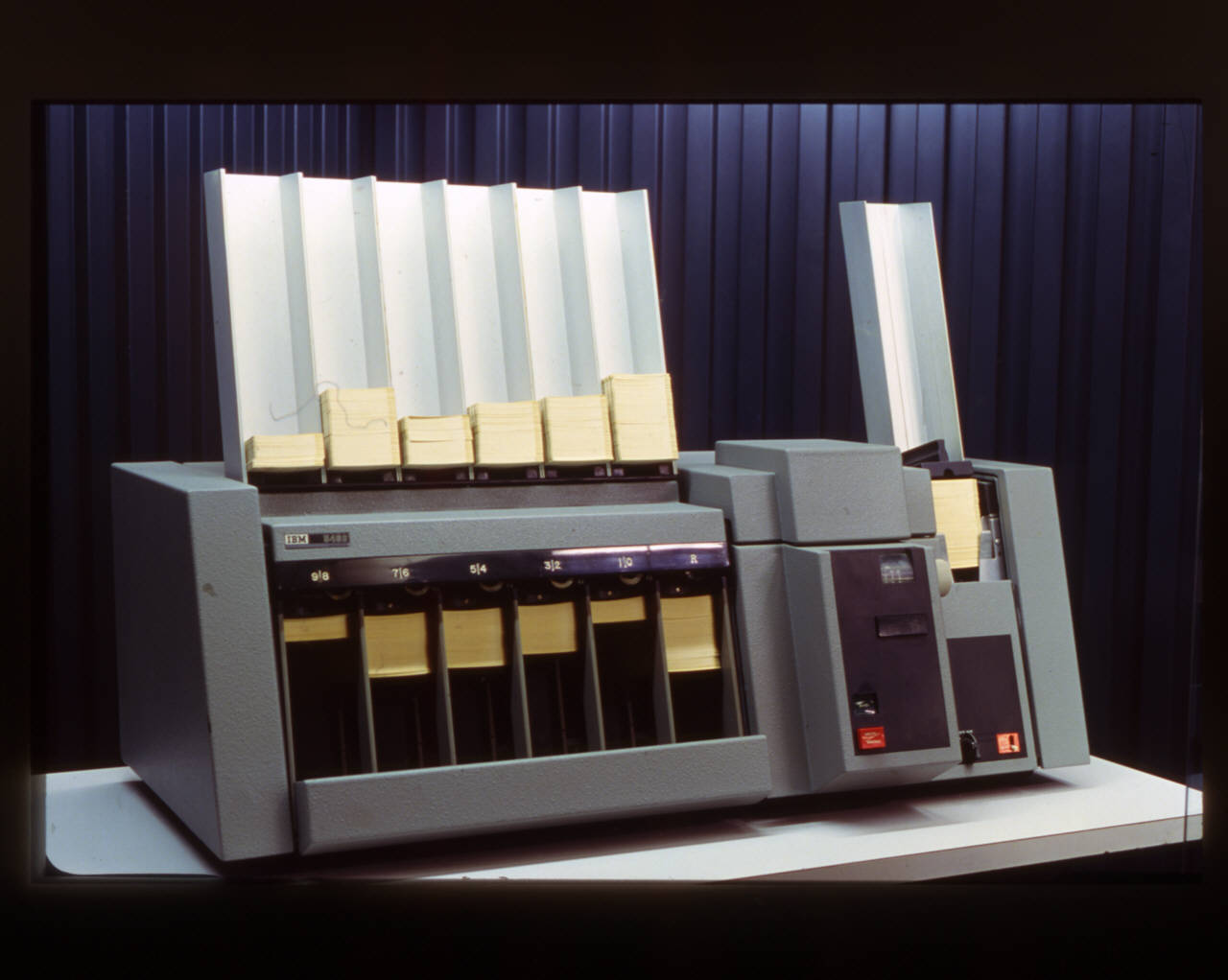 Parallelepipedo in acciao diviso in tre parti. La prima presenta sei scomparti sul davanti che corrispondono, ma non comunicano, superiormente con altrettanti scomparti ad "U" in alluminio; sia in questi ultimi che nei corrispondenti inferiori sono inserite (per gravità sopra, trattenute da un sostegno a molla sotto) altrettante colonne di schede perforate. Ciascun scomparto è contrassegnato in corrispondenza sul fronte della macchina rispettivamente dalle cifre: 9|8, 7|6, 5|4, 3|2, 1|0, R. La seconda parte è più sporgente sul davanti e mostra una manopola comunicante con un indice numerico in una finestrella in alto (selezionatore delle bande per la lettura ottica delle schede) e in basso due interruttori. Poco sopra la manopola, questa parte presenta un coperchio della stessa sua forma che da accesso alla testa di lettura ottica (fascio ottico e sensore fotoelettrico). La terza parte presenta un interruttore a levetta e un commutatore con manopola a farfalla in basso e un'apertura con fuoriuscente uno scomparto in alluminio ad "U" come i precedenti (si tratta del caricatore del lettore ottico), anch'esso contenete una colonna di schede perforate, questa volta pressate dall'alto da un fermo in plastica. Alcune parti interne della macchina sono ricoperte di materiale fonoassorbente.\n\nCaratteristiche tecniche\nRendimento funzionale (numero operazioni al minuto -cpm, card per minuto- rispetto al numero di selezioni/ordinamenti/conteggio -Sorter): con 1.500 cpm approssimativamente si hanno 83 Sorter; con 1.000 cpm approssimativamente si hanno 82 Sorter. \nCapacità del caricatore: 2.000 card