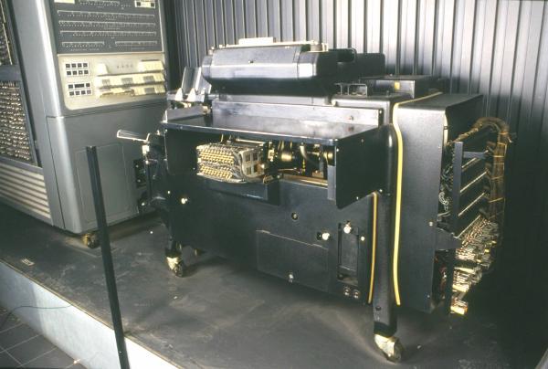 la macchina presenta superiormente una tabulatrice (stampante per i dati dell'output) con affianco un lettore di schede perforate a due caricatori e dall'altra parte un pannello di controllo (Plugboard automatico). I restanti lati della macchina sono coperti da pannelli che racciudono i circuiti e la meccanica interni; per l'esposizione, è stato rimosso un pannello e da sotto ad una mensola sporgente, sul fronte, si distingue un dispositivo elettromagnetico.\nQuattro piedi metallici, provvisti di ruote, sorreggono la macchina.