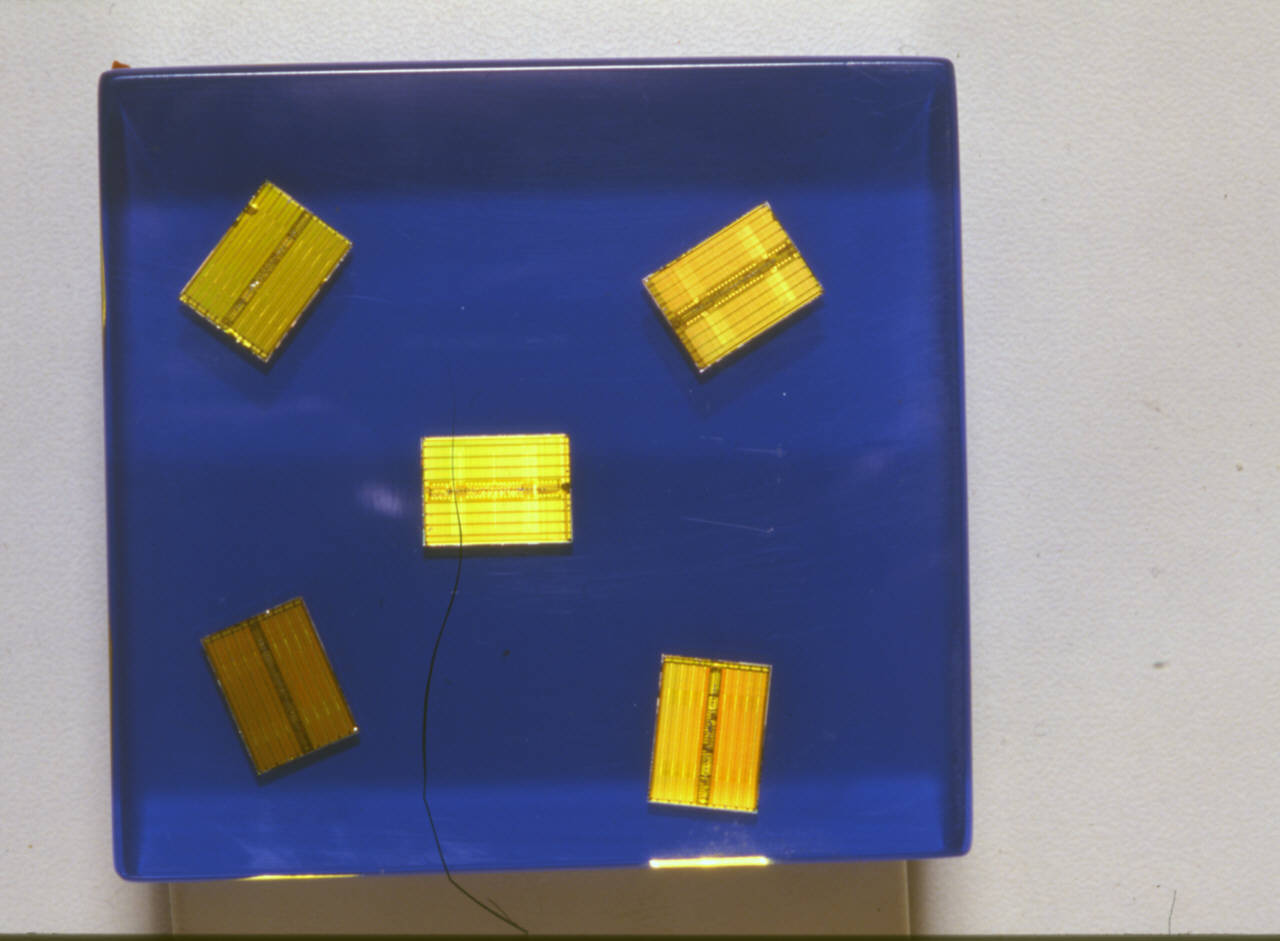 In un parallelepipedo di plexiglass, posizionati ad un paio di millimetri da un foglio di plastica azzurra, sono immerse cinque piastrine di silicio di dimensioni di circa 5x10 mm e di spessore inferiore al millimetro.\nSulla superficie di ciascuna di dette piastrine (chiamate chip) sono evidenti delle micro-incisioni simmetriche rispetto alla mezzeria del lato lungo.