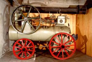 La macchina è formata da due parti funzionalmente distinte: una caldaia, o generatore di vapore, e una motrice che utilizza il vapore prodotto dalla prima parte per generare forza motrice. La caldaia è la parte più ingombrante della macchina con il focolare da un lato, dietro ad un robusto sportello sul lato anteriore della locomobile, e a seguire un corpo cilindrico che termina con la camera del fumo e il camino, quest'ultimo attualmente steso e appoggiato su una forcella nella configurazione "a riposo". All'interno del corpo cilindrico corre il fascio dei tubi da fumo, 26 in tutto, che parte dalla piastra a tubi visibile nel focolare e arriva in fondo alla camera dei fumi e, quindi, al camino dove porta i fumi della combustione. Il fascio tubolare, le pareti ed il cielo del focolare costituiscono la superficie riscaldante della caldaia: con la macchina in funzione, sono coperti dall'acqua. Al di sopra del corpo cilindrico, si estende il meccanismo del motore che sfrutta il vapore grazie ad uno stantuffo a doppio effetto posto nella camera di espansione, o cilindro, fissata sopra il focolare; Il piede dello stantuffo tramite uno snodo detto "testacroce" si collega alla biella che a sua volta, tramite l'abero-manovella, aziona il volano posto sul lato destro della macchina. In prossimità della camera di espansione, sempre sul lato destro, è presente il regolatore di Watt che, azionato dal movimento del volano, agisce sulla valvola, detta "a farfalla", che regola il flusso del vapore in ingresso nel cilindro. Sul lato sinistro, è ben visibile il tubo uscente dal cilindro che porta il vapore di scarico alla base del camino per aiutare l'uscita dei fumi della combustione. La macchina a vapore, così fatta, è montata su un carro metallico avente le ruote anteriori, munite di freni in legno per lo stazionamento, di diametro maggiore rispetto a quelle posteriori.\nAltri dati tecnici\nLocomobile a vapore ad un cilindro\nPotenza effettiva: 13 Cv\nDiametro del cilindro: 203 mm, fascia: 305 mm\nDiametro del volano: 1370 mm, fascia: 165 mm\nGiri del motore: 140 giri/minuto\nTubi bollitori: 26, diametro: 63mm\nSuperficie riscaldata: 10 mq\nPressione: 8 kg/cm2\n\n\n\n\n\n.