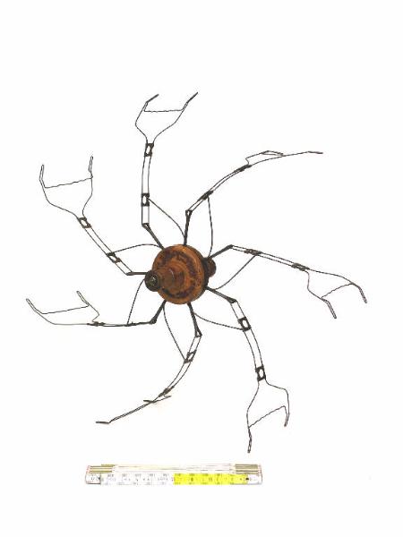 Aspino abbattibile a 7 raggi in filo metallico. 7 archi sagomati sono imperniati su una coppia di dischi in legno che proteggono un meccanismo che, se ruotato, permette l'abbattimento dell'aspino. Un perno centrale tornito permette l'appoggio dell'aspino sul supporto. Su una faccia del disco di legno, impresso a fuoco: "PAT BREV. SGDG / DH 546V / HORGEN ZURICH / (firma illeggibile) / DRP".
