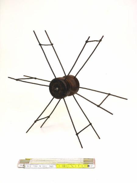Aspino regolabile, con 6 coppie di raggi metallici sottili, a sezione circolare, legati da listelli metallici scorrevoli lungo i raggi. Il corpo centrale è in legno tornito.