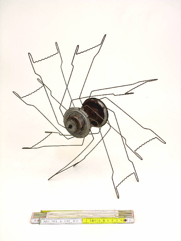 Aspino abbattibile, con 8 raggi in filo metallico. Il corpo centrale è formato dal meccanismo, protetto entro un guscio metallico e dal perno centrale in legno tornito.