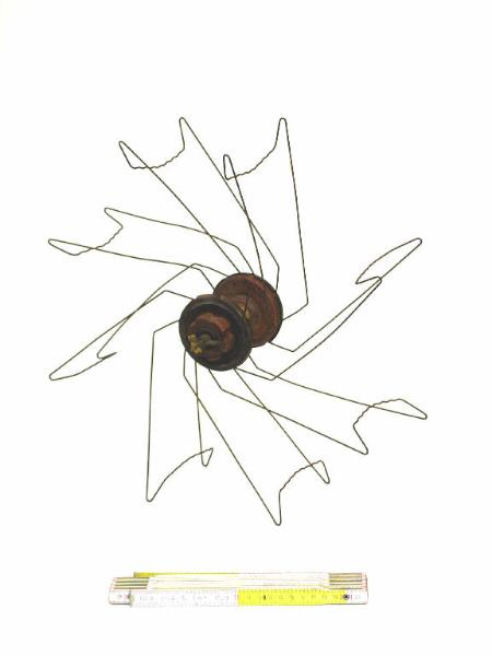 Aspino abbattibile, con 8 raggi in filo metallico. Il corpo centrale è formato dal meccanismo, protetto entro un guscio metallico e dal perno centrale in legno tornito. Sul metallo, inciso entrambe le facce: "CIMAT - FUSI SILVIO - PARABIAGO - ITALIA"