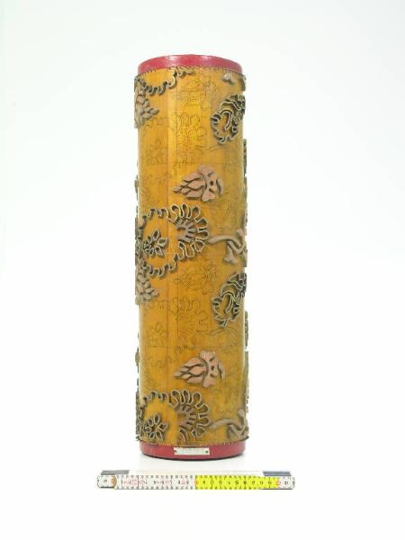 Cilindro in legno con elementi in rilievo e con anima cilindrica cava in ferro: i contorni dei motivi sono delineati da lamine metalliche infisse nel legno del cilindro e sporgenti da questo per alcuni millimetri; l'interno dei motivi è riempito di pasta di legno (?). I motivi in rilievo sono quelli che dovranno essere stampati di uno stesso colore: il disegno, in questo caso a due colori, è però tracciato per intero a china sul cilindro. Sulla porzione di ferro è applicata una targhetta metallica riportante il numero del disegno: 110993. Il disegno completo comprende questo cilindro + INVN 000994