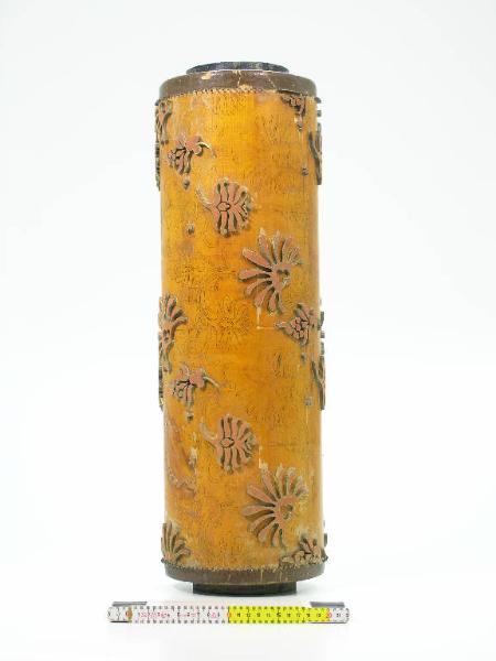 Cilindro in legno con elementi in rilievo e con anima cilindrica cava in ferro: i contorni dei motivi sono delineati da lamine metalliche infisse nel legno del cilindro e sporgenti da questo per alcuni millimetri; l'interno dei motivi è riempito di pasta di legno (?). I motivi in rilievo sono quelli che dovranno essere stampati di uno stesso colore: il disegno è però tracciato per intero a china sul cilindro. Sulla testa del cilindro è applicata una targhetta metallica riportante il numero del disegno: 849/67; sulla porzione in legno è inciso "2/3115"; sulla superficie del cilindro è scritto a mano "verde" ad indicare probabilmente il colore da stampare. Mancano gli altri cilindri componenti il disegno completo