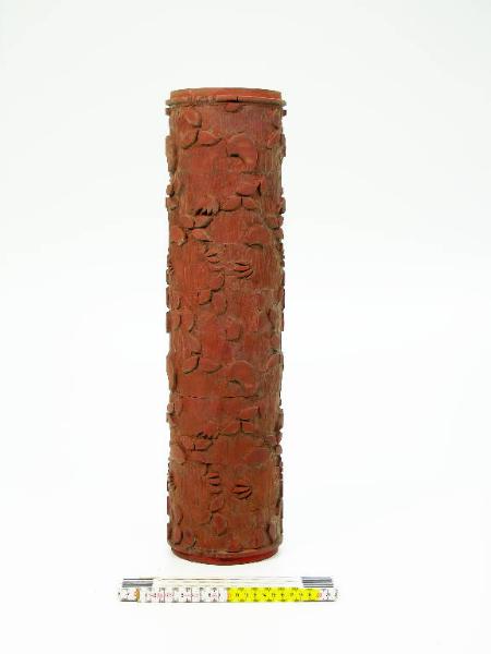 Cilindro cavo con struttura in ferro e uno spesso rivestimento in gomma dura. La gomma è fissata alla superficie del cilindro in strisce trasversali giustapposte, di circa 6 cm di larghezza, ed è incisa in modo da lasciare rilevati i motivi da stampare. Sulla testa del cilindro una targhetta metallica riporta il numero del disegno 891/73. Mancano gli altri cilindri componenti il disegno completo