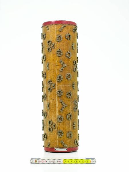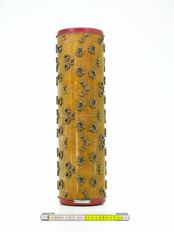 Cilindro in legno con elementi in rilievo e con anima cilindrica cava in ferro: i contorni dei motivi sono delineati da lamine metalliche infisse nel legno del cilindro e sporgenti da questo per alcuni millimetri; l'interno dei motivi è riempito di pasta di legno (?). I motivi in rilievo sono quelli che dovranno essere stampati di uno stesso colore: il disegno è però tracciato per intero a china sul cilindro. Alla base del cilindro è applicata una targhetta metallica riportante il numero del disegno: 1108/93. Mancano gli altri cilindri componenti il disegno completo