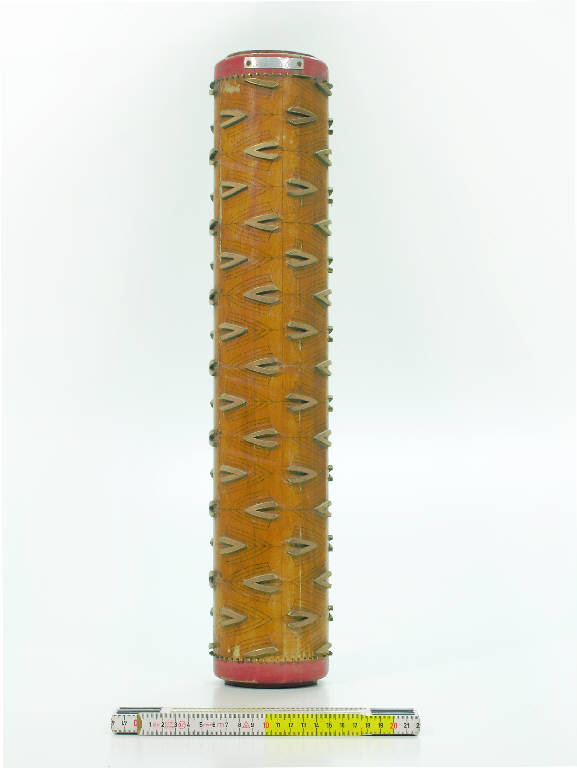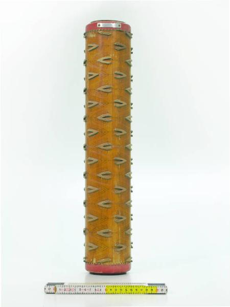 Cilindro in legno con elementi in rilievo e con anima cilindrica cava in ferro: i contorni dei motivi sono delineati da lamine metalliche infisse nel legno del cilindro e sporgenti da questo per alcuni millimetri; l'interno dei motivi è riempito di pasta di legno (?). I motivi in rilievo sono quelli che dovranno essere stampati di uno stesso colore: il disegno è però tracciato per intero a china sul cilindro. Alla base del cilindro è applicata una targhetta metallica riportante il numero del disegno: 992/78. Mancano gli altri cilindri componenti il disegno completo