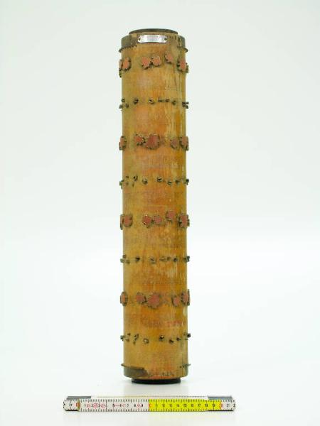 Cilindro in legno con elementi in rilievo e con anima cilindrica cava in ferro: i contorni dei motivi sono delineati da lamine metalliche infisse nel legno del cilindro e sporgenti da questo per alcuni millimetri; l'interno dei motivi è riempito di pasta di legno (?). I motivi in rilievo sono quelli che dovranno essere stampati di uno stesso colore: il disegno, a tre colori, è però tracciato per intero a china sul cilindro. Sulla parte in acciaio è applicata una targhetta metallica riportante il numero del disegno: 914/77. Il disegno completo comprende questo cilindro e quelli con INVN 001008 e INVN 001010