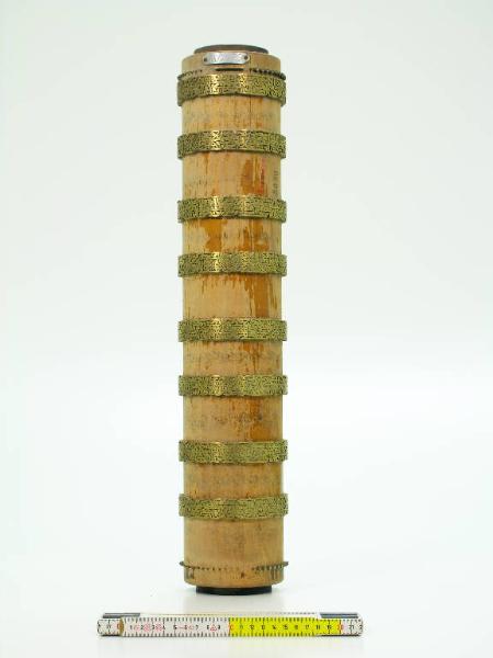Cilindro in legno con elementi in rilievo e con anima cilindrica cava in ferro: i contorni dei motivi sono delineati da lamine metalliche infisse nel legno del cilindro e sporgenti da questo per alcuni millimetri; l'interno dei motivi è riempito di pasta di legno (?). I motivi in rilievo sono quelli che dovranno essere stampati di uno stesso colore: il disegno, a tre colori, è però tracciato per intero a china sul cilindro. Sulla parte in acciaio è applicata una targhetta metallica riportante il numero del disegno: 914/77. Il disegno completo comprende questo cilindro e quelli con INVN 001008 e INVN 001009