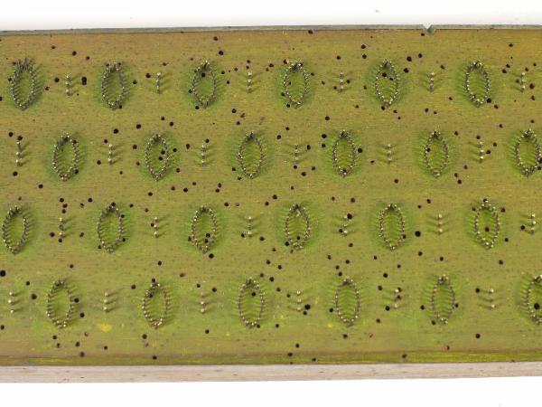L'oggetto è costituito da una tavola di legno in cui sono inseriti (con sporgenza di alcuni mm) chiodini realizzati in ottone a formare un motivo geometrico. Il motivo era probabilmente a due colori, infatti sulla superficie del cilindro è tracciata ad inchiostro un'altra parte del disegno. Su uno dei lati corti compare il riferimento al numero del disegno, tracciato ad inchiostro: "380".