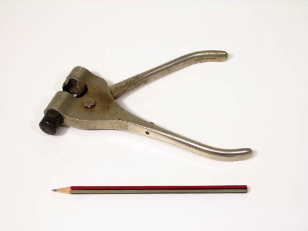 Lo strumento è costituito da una sorta di pinza in cui l'azione sui manici porta un pistone con estremità leggermente convessa a premere contro una complementare piastra circolare leggermente concava. La pinza possiede una molla per l'apertura dei manici. Le due parti complementari schiacciano le due parti di un frapposto sigillo e ne permettono la chiusura attorno alle estremità della reggia o della corda di confezione del pacco. Su uno dei due pistoni compare il numero "66" relativo probabilmente al calibro del sigillo
