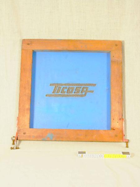 L'oggetto è un quadro da stampa con cornice di legno e buratto in tela di bronzo. Lo strumento stampa il logo "TICOSA": l'area riservata è contornata da una sottile piattina metallica ripiegata sul quadro e sporgete di circa 4 mm. alla stampa "flock" in rilievo su tessuti pesanti. Si tratta di una delle lavorazioni sperimentali provate durante il periodo di attività dell'azienda. Il disegno, a due colori, si completa con il quadro INVN 001112