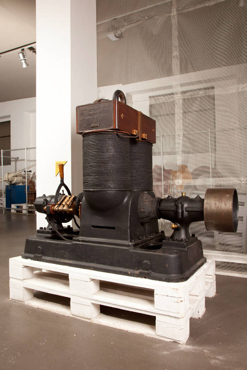 Dispositivo costituito da un avvolgimento di rame ad asse orizzontale (indotto), rivestito con isolante, che può ruotare tra le espansioni di due elettromagneti a bobina cilindrica verticale (induttore). Una puleggia è posta ad un'estremità dell'indotto, mentre sull'altro estremo è visibile il sistema formato dal collettore e da tre coppie di spazzole (sistema di prelievo). L'asse dell'indotto è sospeso tramite due cavalletti che, assieme alla parte inferiore del corpo delle espansioni dell'induttore, sono imbullonati ad una massiccia base metallica; sul cavalletto del sistena di prelievo è visibile una leva con manico in legno collegata alle spazzole del sistema di prelievo. All'estremità superiore dell'induttore è posto un blocco metallico a tenere unite superiormente le due bobine (il blocco è parte del traferro dell'induttore); il blocco è rivestito di tavolette lignee sui lati lunghi chiuse, sui lati corti, da due targhe metalliche; su un fronte del blocco, sulla tavoletta, lato sistema di prelievo, è posto un selettore in rame. Sulla sommità dello stesso blocco è visibile un anello metallico per il sollevamento della macchina.