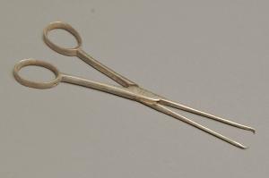 Strumento a forma di forbice, le cui punte terminano con due piccoli denti leggermente incurvati.