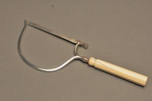 Su un'impugnatura di avorio a sezione ottagonale è fissato un arco di acciaio che sostiene una lama dentata. Un dispositivo a vite, posto dalla parte dell'impugnatura, consentiva di regolare la tensione della lama.