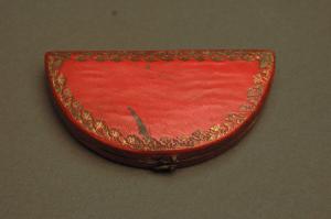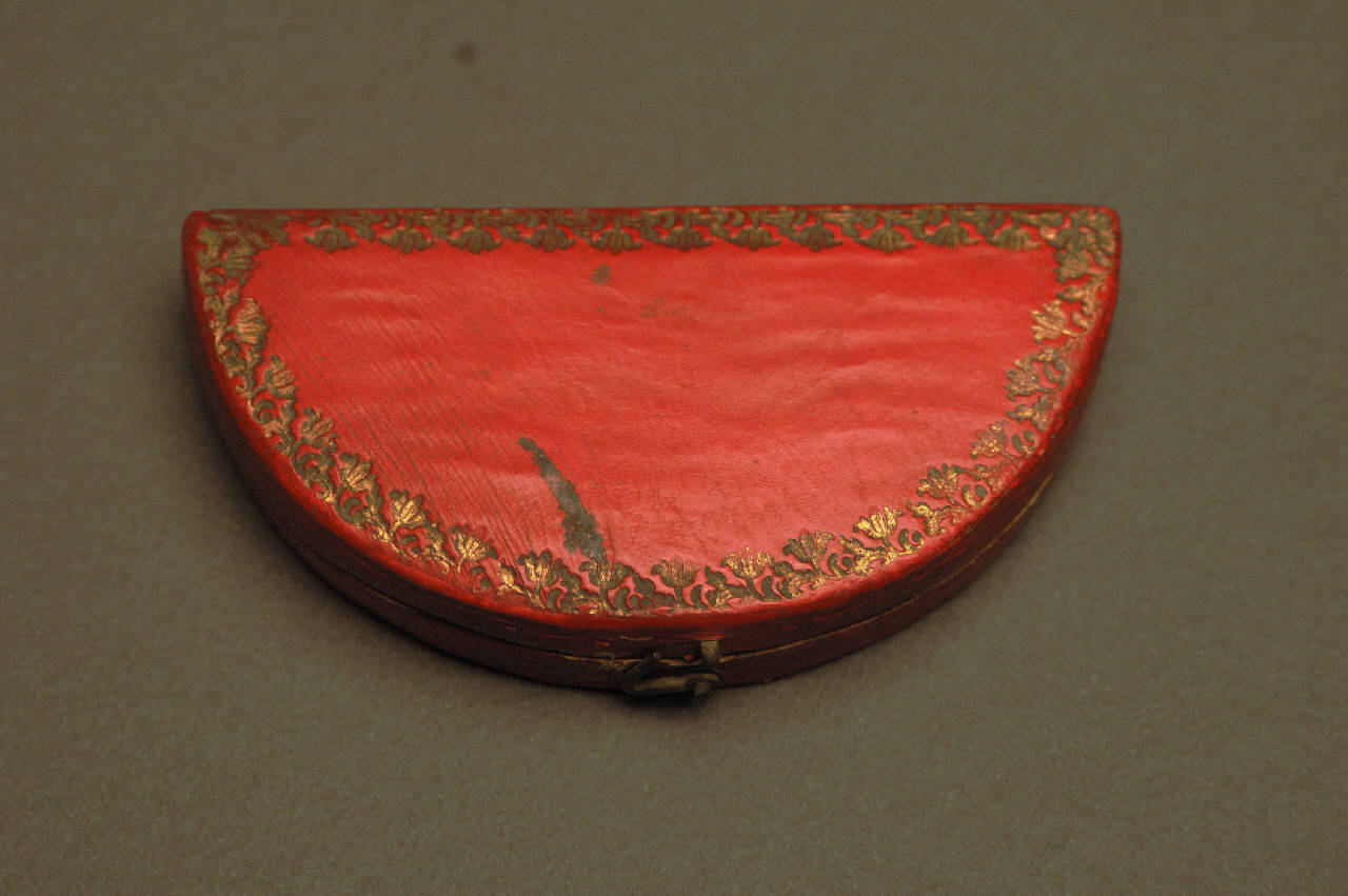 Piccola scatola di legno, a forma di mezzaluna, rivestita con pelle rossa, con decorazioni in oro, foderata all'interno di velluto verde.