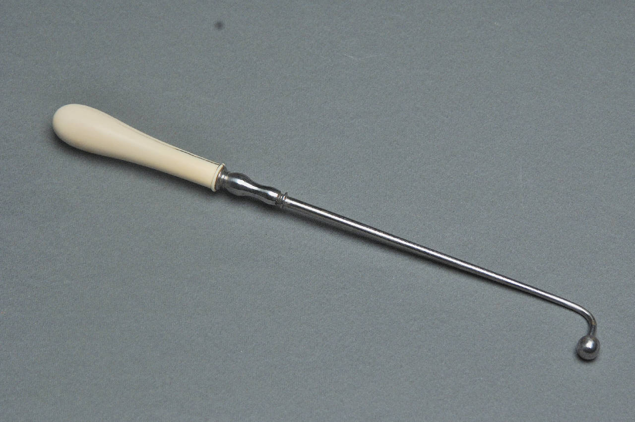 Su un'impugnatura in avorio tornita è avvitata un'asta metallica ricurva, terminante con una punta a sfera. L'intera asta poteva essere svitata dall'impugnatura per essere posta nel fuoco.