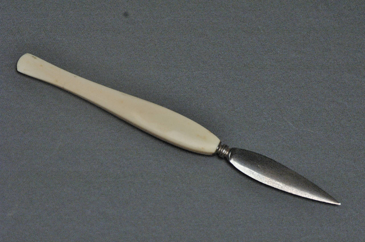 Bisturi con impugnatura di avorio e lama di acciaio, di forma ovale, appuntita, tagliente su entrambi i lati.