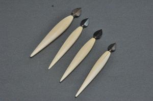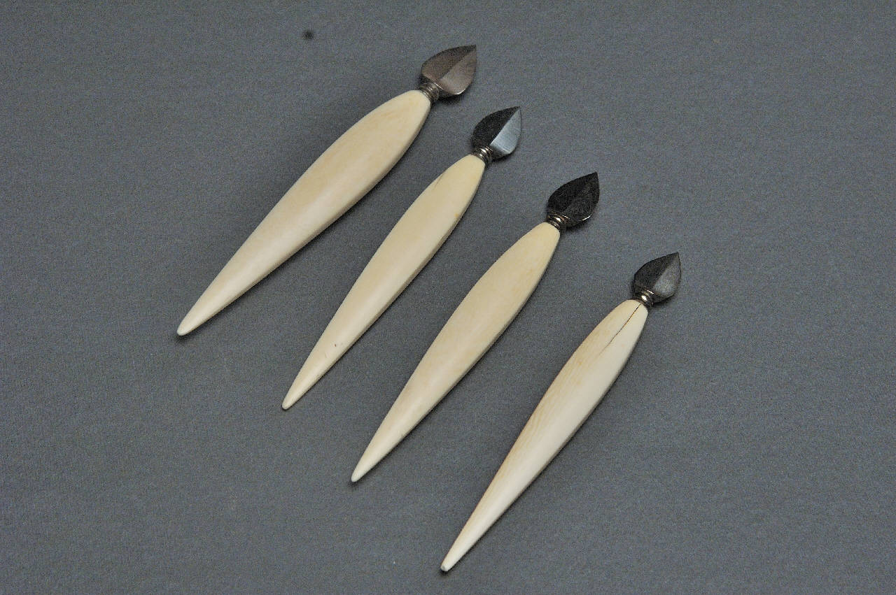Bisturi con impugnatura di avorio e lama di acciaio, a foglia di mirto, appuntita, tagliente su entrambi i lati e leggermente ispessita al centro.