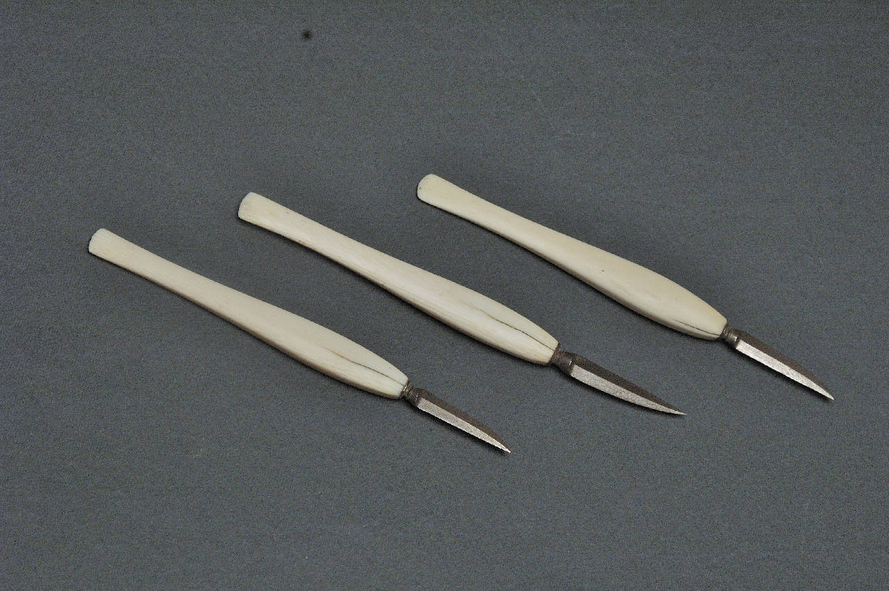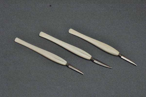 Bisturi con impugnatura di avorio e lama di acciaio, di forma triangolare, con un lato leggermente convesso, tagliente su entrambi i lati e leggermente inspessita al centro.