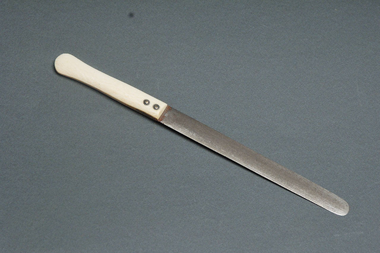 Lunga spatola dritta, molto sottile fissata ad una impugnatura in avorio .