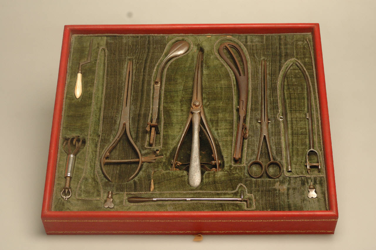 Scatola priva di coperchio, rivestita in pelle rossa con decorazioni dorate, foderata di velluto verde. All'interno sono posizionati, in appositi alloggiamenti, strumenti per l'estrazione di calcoli urinari dalla vescica femminile e per l'estirpazione di polipi utero-vaginali. I pezzi erano in tutto dieci (con due accessori), uno dei quali oggi mancante.