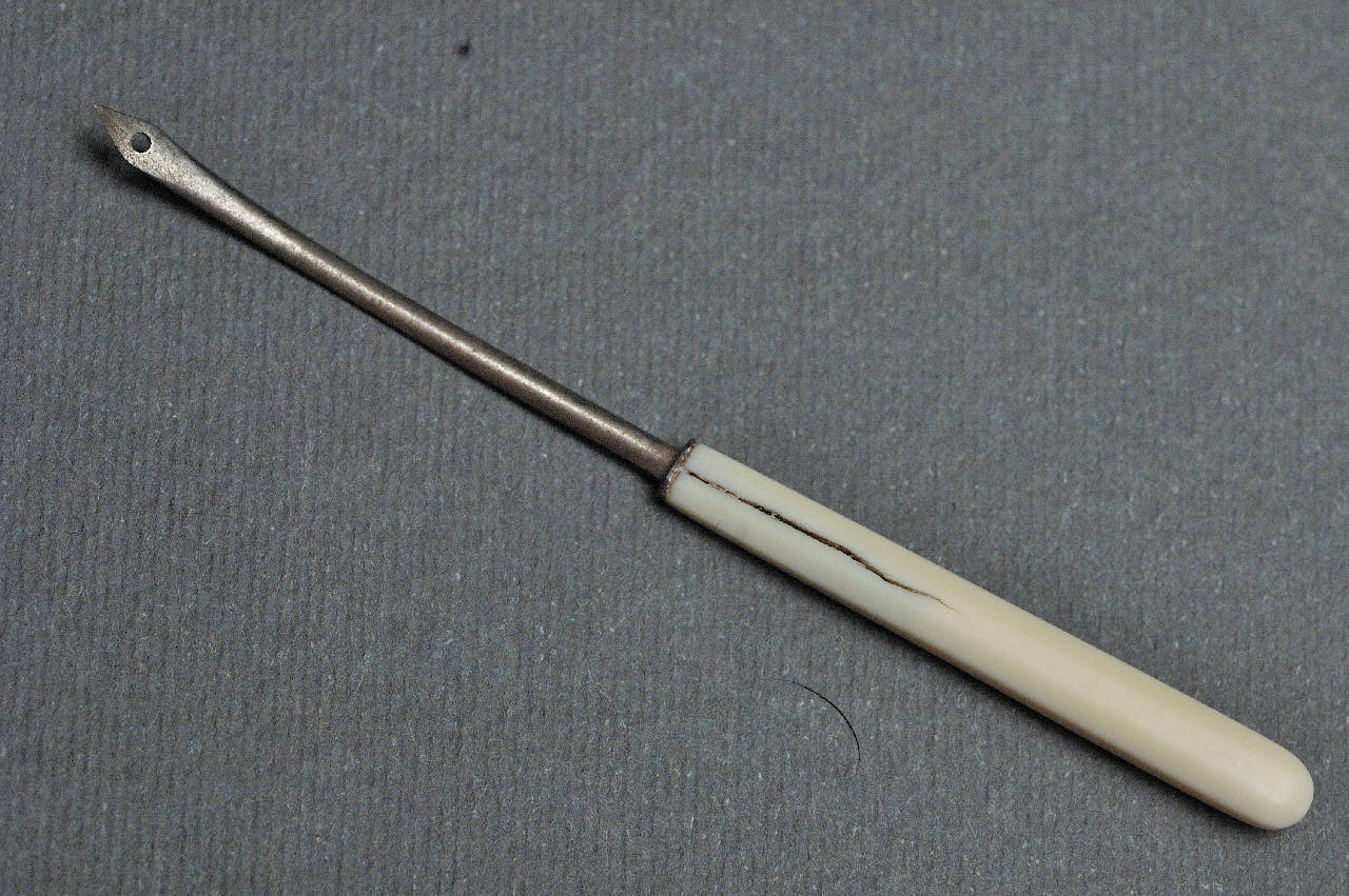 Ago dotato di un'impugnatura di avorio. Un foro circolare è praticato appena sotto la punta.
