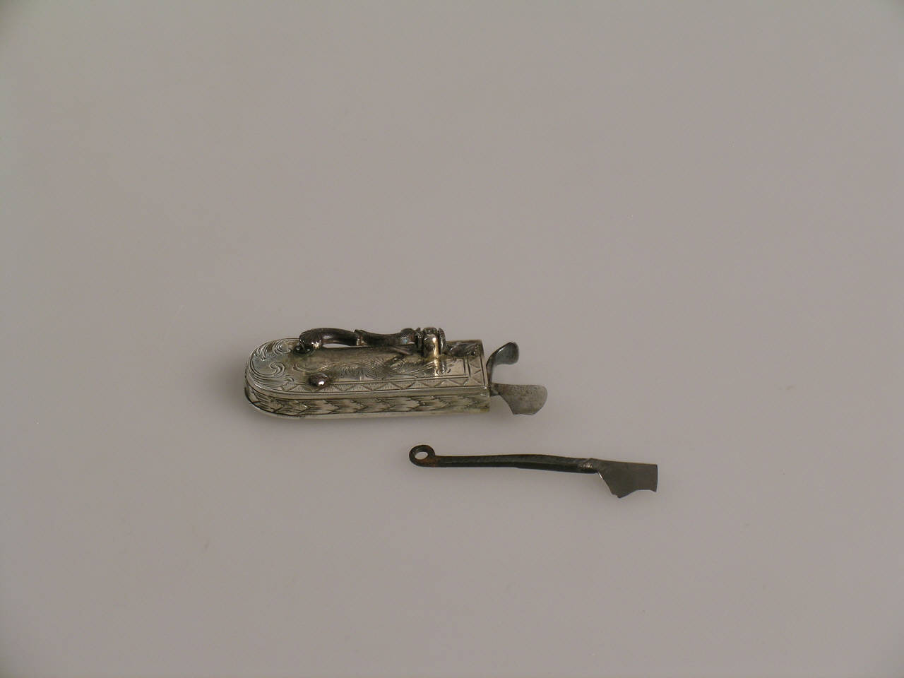 Un'acuminata lametta a mezzaluna fuoriesce da un'impugnatura di argento decorato. Accanto alla lametta si trova un piccolo dispositivo a molla che può essere arretrato fino a un punto di blocco e poi sbloccato premendo una piccola leva che si trova nell'impugnatura. Al momento dello sblocco il dispositivo a molla colpisce la lametta facendola scattare con forza in avanti. \nLo strumento è corredato di una seconda lametta di scorta.
